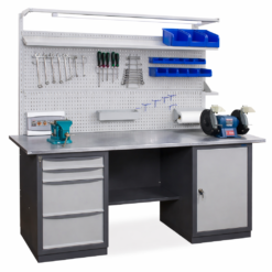 Garažams, dirbtuvėms ir sandėliams pritaikytas, tvirtas ir labai universalus darbastalis. Galite komplektuoti šį darbastalį užsisakydami praktiškus, Jūsų darbo vietą gerinančius, darbą lengvinančius ir poreikius atitinkančius priedus. Stalviršis yra 24 mm OSB plokštė padengta 2mm dažytu plienu. Tai nebrangus ir labai universalus darbastalis, kuris tiks nedidelėse dirbtuvėse ir pan.