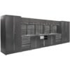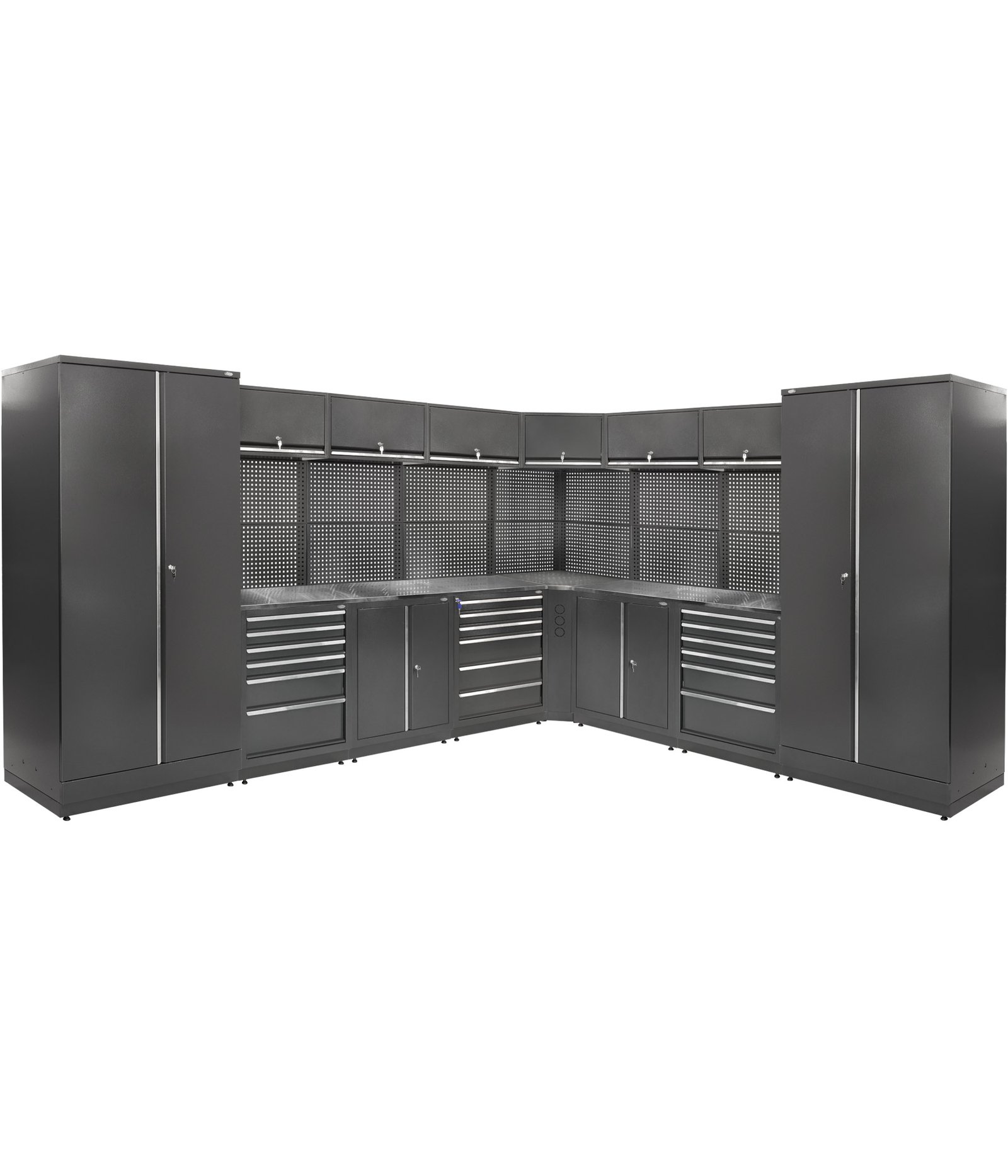 Sistema leidžia maksimaliai išnaudoti kampinę erdvę, todėl puikiai tinka tiek profesionaliam autoservisui, tiek privačiam garažui, kuriame reikalinga tvarka, talpa ir funkcionalumas. Rakinamos spintos ir stalčiai apsaugo įrankius nuo dulkių ir nepageidaujamų asmenų, o perforuotos sienelės suteikia galimybę įrankius laikyti matomai ir lengvai pasiekiamus.