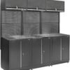 Modulinė garažo ir dirbtuvių sistema su 2 aukštomis spintomis, stalčių bloku ir viršutiniais moduliais
