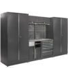Ši aukštos kokybės modulinė garažo sistema idealiai tinka tiems, kurie ieško didelės talpos, patvarumo ir profesionalios darbo vietos organizacijos. Konstrukciją sudaro dvi erdvios aukštos spintos, užrakinami viršutiniai moduliai, platus metalinis darbo paviršius, perforuota sienelė ir stalčių blokas su guoliniais bėgeliais – viskas sukurta taip, kad suteiktų maksimalų patogumą dirbant tiek servise, tiek namų garaže.