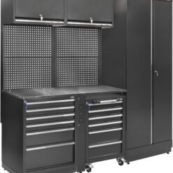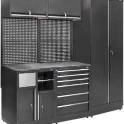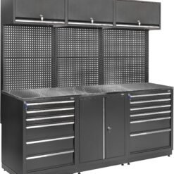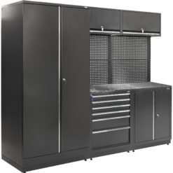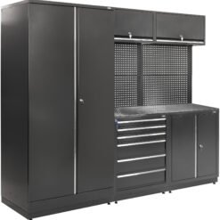 Tai puikus pasirinkimas, jei norite turėti viename komplekte viską, ko reikia efektyviai darbo vietai: aukštas spintas dideliems daiktams, stalčių bloką smulkiems įrankiams, kabinimo sienelę ir tvirtą darbastalį. Konstrukcija sukurta taip, kad tarnautų ilgai, o jos funkcionalumas leis dirbti greičiau ir patogiau.