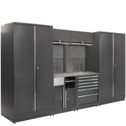 Ši aukštos kokybės modulinė garažo sistema idealiai tinka tiems, kurie ieško didelės talpos, patvarumo ir profesionalios darbo vietos organizacijos. Konstrukciją sudaro dvi erdvios aukštos spintos, užrakinami viršutiniai moduliai, platus metalinis darbo paviršius, perforuota sienelė ir stalčių blokas su guoliniais bėgeliais – viskas sukurta taip, kad suteiktų maksimalų patogumą dirbant tiek servise, tiek namų garaže.