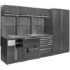 Ši universali ir talpi modulinė garažo sistema sukurta meistrams, kurie siekia maksimalios tvarkos, patogumo ir vietos optimizavimo dirbtuvėse ar garaže. Konstrukciją sudaro trys užrakinami viršutiniai moduliai, centrinė darbo zona su nerūdijančio plieno paviršiumi, perforuota įrankių sienelė, talpus stalčių blokas, integruotas šiukšliadėžės skyrius bei erdvi aukšta spinta. Tai profesionali darbo stotis, skirta intensyviam naudojimui.