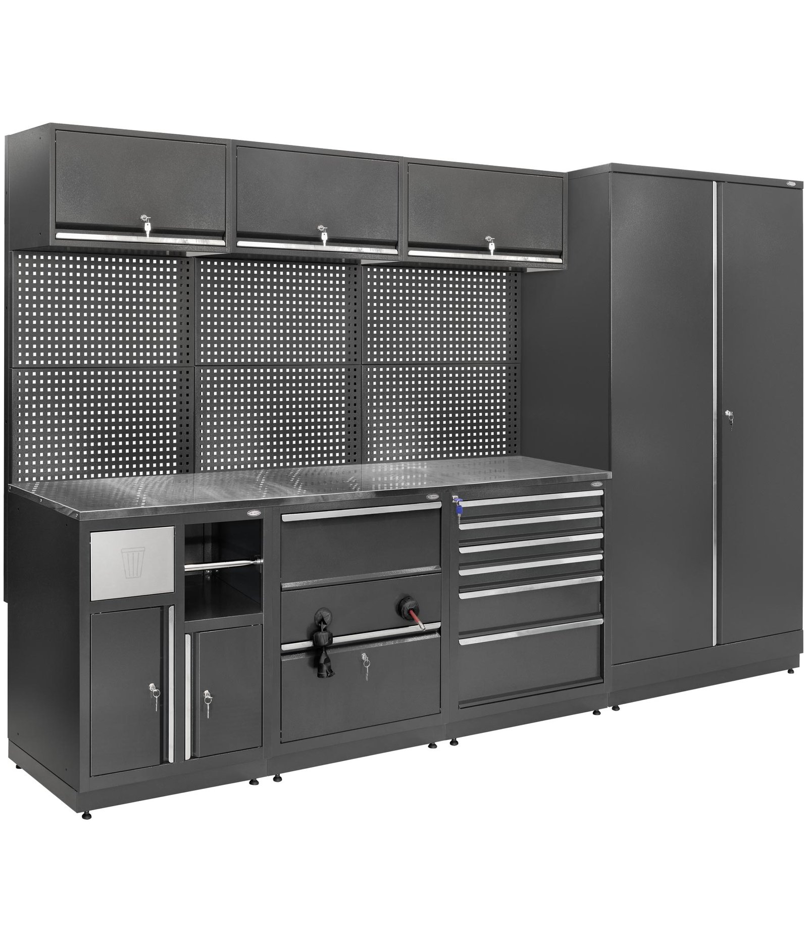 Modulinė garažo baldų sistema L-04-004 – tai profesionaliam naudojimui sukurta, itin tvirta ir funkcionali darbo bei įrankių saugojimo sistema, puikiai tinkanti garažui, dirbtuvėms, autoservisui ar sandėliui. Ši komplektacija sujungia erdvias metalines spintas, stalčių bloką, šiukšliadėžės modulį ir specialų įrankių laikymo skyrių, užtikrindama tvarkingą ir efektyvų darbo aplinkos organizavimą.
