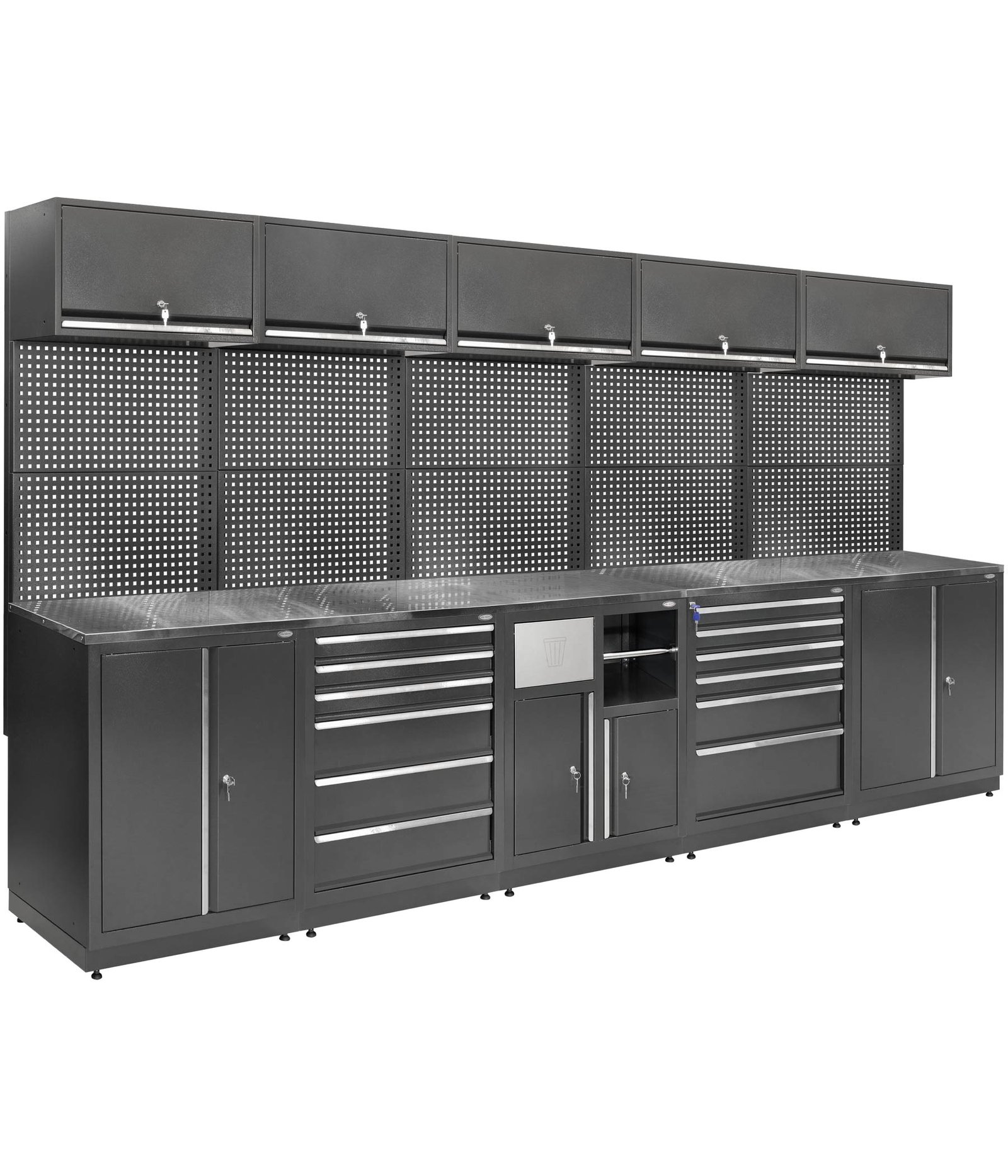 Ši komplektacija sujungia erdvią nerūdijančio plieno darbo zoną, didelės talpos spintas, funkcionalias stalčių spinteles bei pakabinamas spinteles – viskas, ko reikia efektyviam garažo ar dirbtuvių organizavimui. Perforuota sienelė leidžia lengvai išdėstyti dažniausiai naudojamus įrankius ir palaikyti tobulą tvarką.